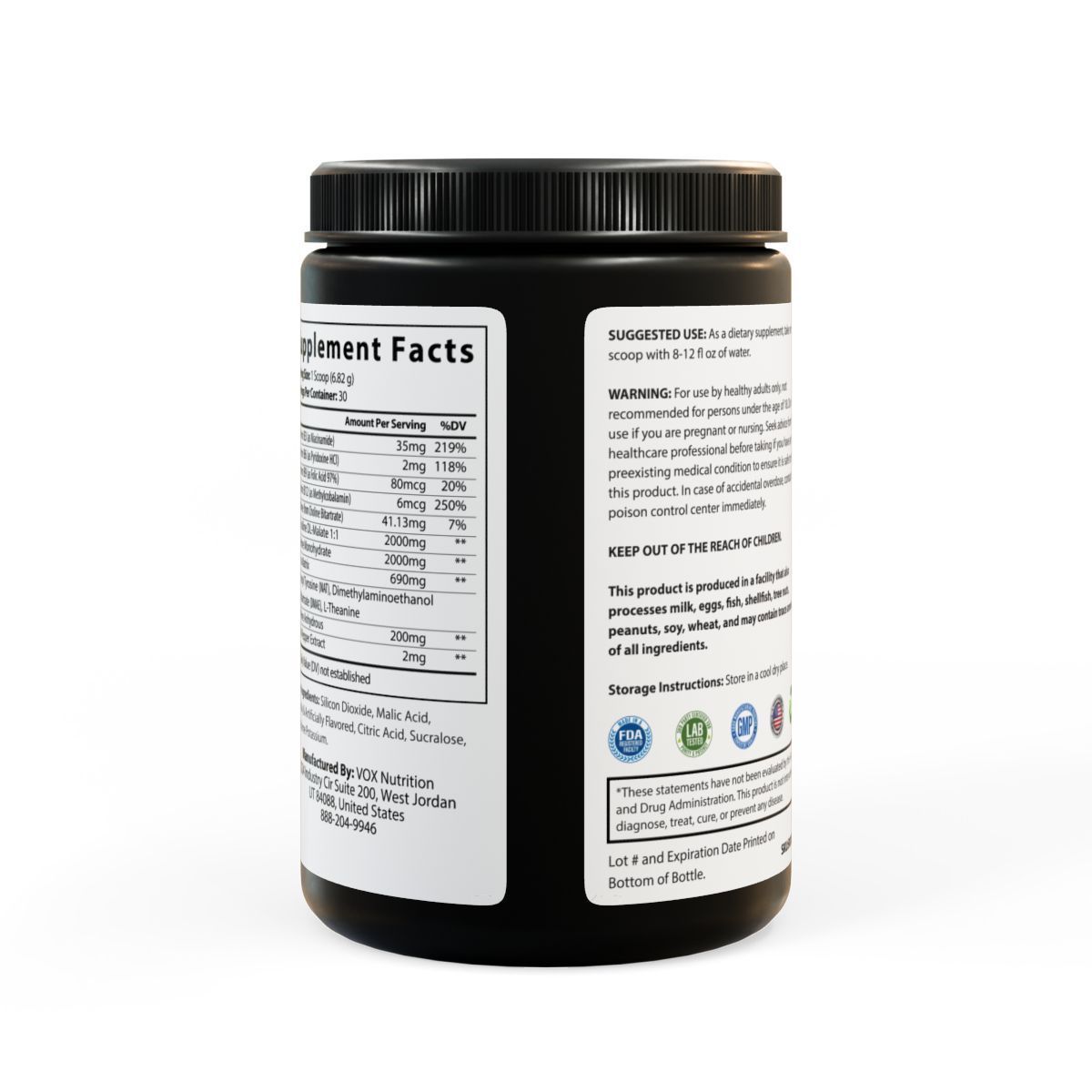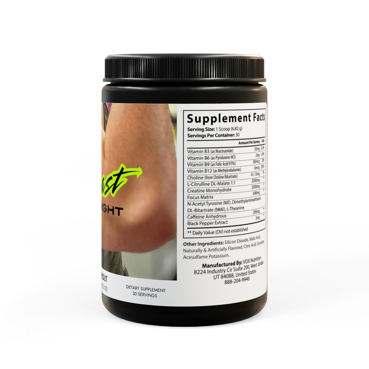 Ingredientes: Vitamina B3 (como niacinamida), vitamina B6 (como clorhidrato de piridoxina), vitamina B9 (como ácido fólico 97%), vitamina B12 (como metilcobalamina), colina (de bitartrato de colina), L-citrulina DL-malato 1:1, monohidrato de creatina, N-acetiltirosina (NAT), dimetilaminoetanol, DL-bitartrato (DMAE), L-teanina, cafeína anhidra, extracto de pimienta negra. Otros ingredientes: dióxido de silicio, ácido málico, saborizante natural y artificial, ácido cítrico, sucralosa, acesulfamo de potasio.