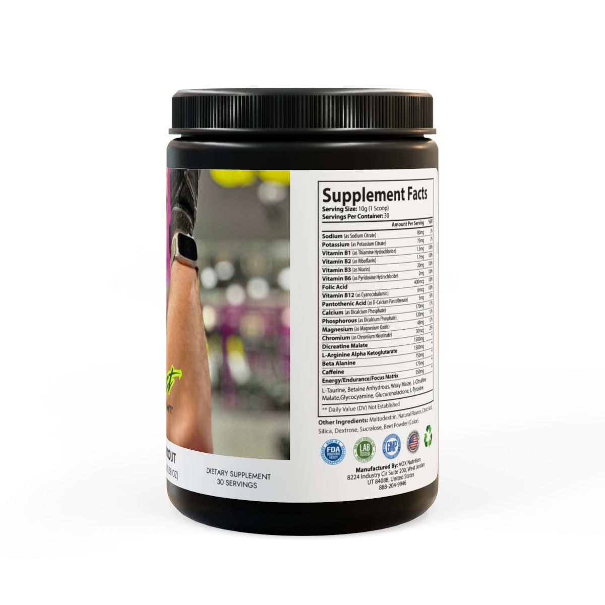 Ingredientes: Sodio (como citrato de sodio), potasio (como citrato de potasio), vitamina B1 (como clorhidrato de tiamina), vitamina B2 (como riboflavina), vitamina B3 (como niacina), vitamina B6 (como clorhidrato de piridoxina), ácido fólico, vitamina B12 (como cianocobalamina), ácido pantoténico (como D-pantotenato de calcio), calcio (como fosfato dicálcico), fósforo (como fosfato dicálcico), magnesio (como óxido de magnesio), cromo (como nicotinato de cromo), dicreatina malato, L-arginina alfa cetoglutarato, beta-alanina, cafeína, L-taurina, betaína anhidra, maíz ceroso, L-citrulina, malato, glicociamina, glucuronolactona, L-tirosina. Otros ingredientes: Maltodextrina, aromas naturales, ácido cítrico, sílice, dextrosa, sucralosa, polvo de remolacha (colorante).